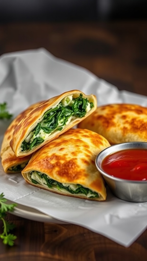 The flaky crust encases a warm, cheesy filling that pairs perfectly with a side of marinara sauce for dipping. These calzones are not only tasty but also a fun way to sneak some greens into your dinner. Give them a try for a quick meal that everyone will love!